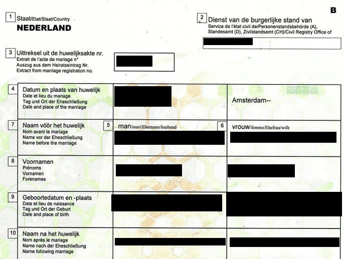 - Evliliğin yapıldığı Belediyeden son 6 ay içinde alınmış Uluslararası Evlilik Belgesi (Formül B - Internationale Huwelijksakte) aslı ve fotokopisi (Belge örneği aşağıdadır).